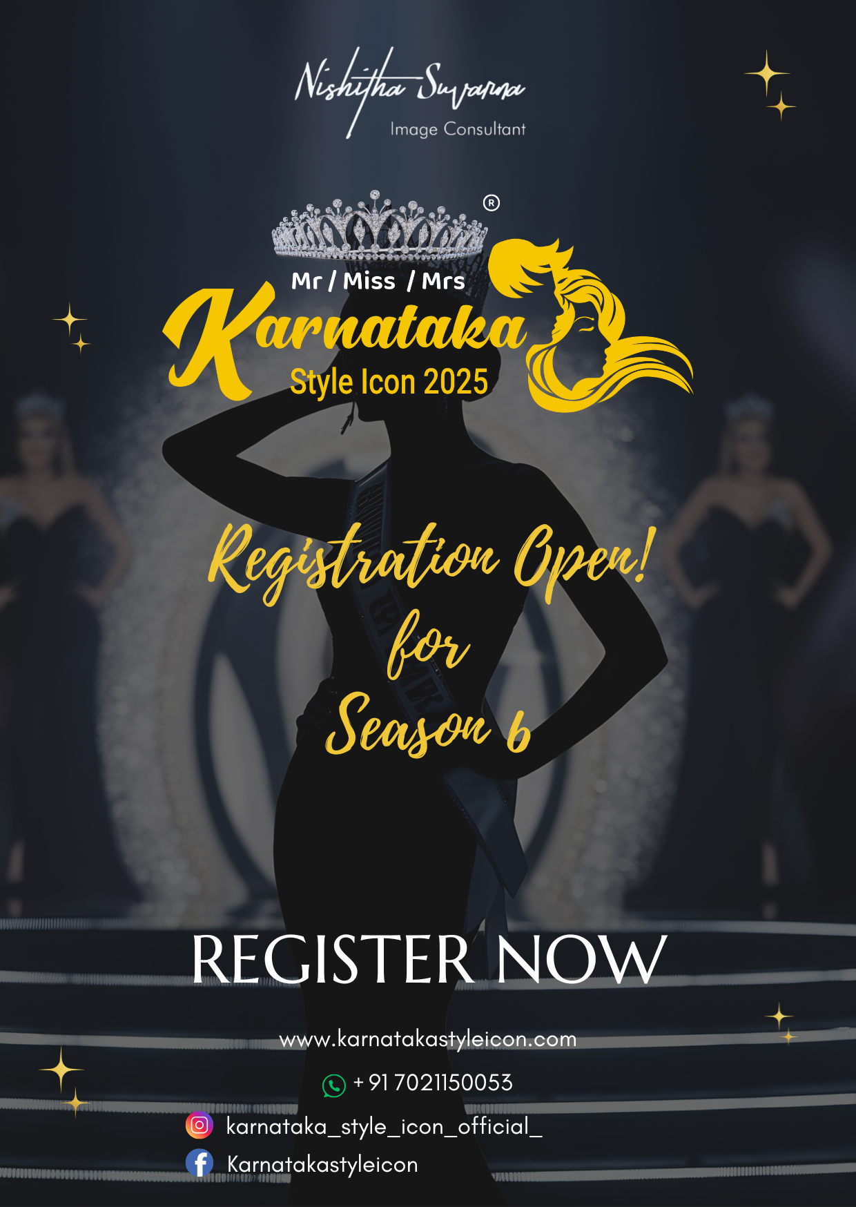 Nishitha Suvarna is a visionary leader and the driving force behind Mr|Miss|Mrs Karnataka Style Icon. A certified image consultant and personality enhancement expert from Mumbai, Nishitha hails from the vibrant city of Mangalore. Her journey into the world of beauty and fashion is fueled by a deep passion for empowering individuals to become the best versions of themselves, both inside and out.